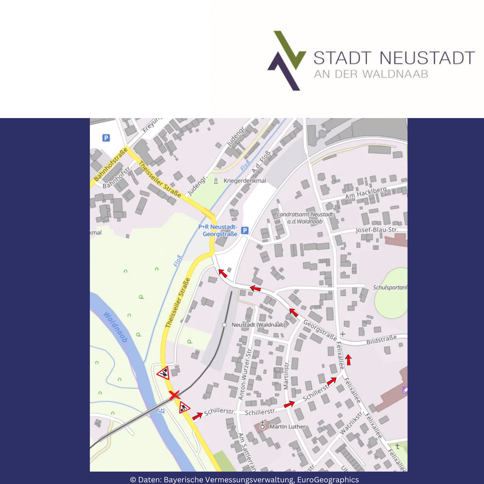 Aufgrund eines Wasserrohrbruchs war die Theilsseiler Straße im Bereich der Bocklbahnbrücke seit Montag, 06.10.2025, 08:00 Uhr bis auf Weiteres voll gesperrt.