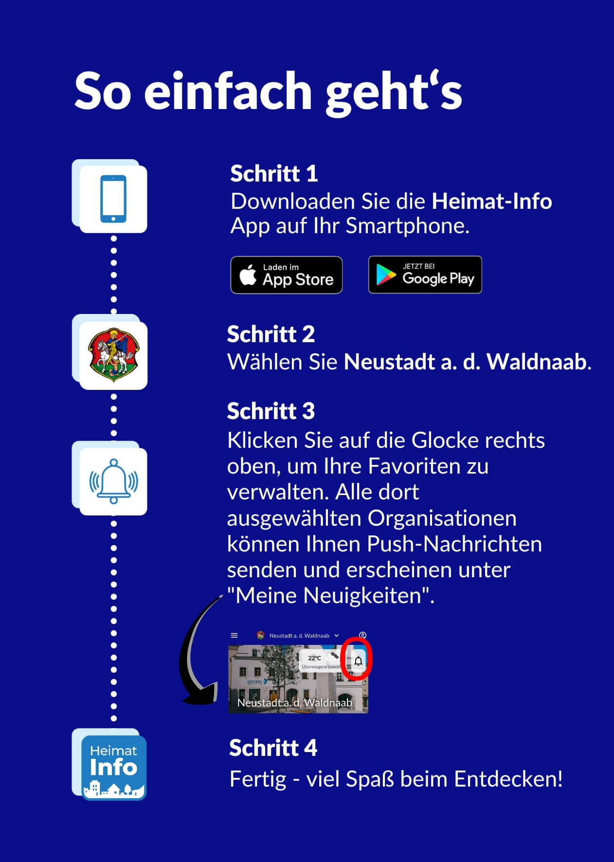 Herzlich Willkommen! Mit der neuen Neustadt a. d. Waldnaab App „Heimat-Info“ sind Sie ab sofort tagesaktuell per Smartphone informiert.