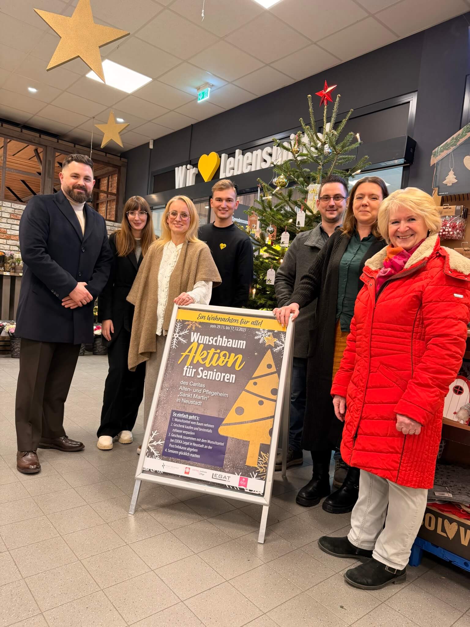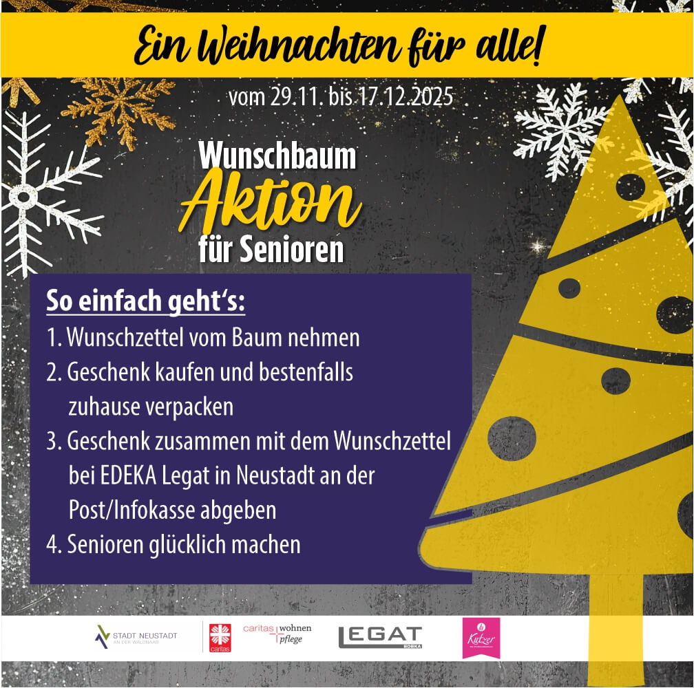 Nicht alle Menschen erleben die Weihnachtszeit voller Freude, Familie und Geschenke. Gerade viele ältere Menschen in Pflegeheimen verbringen diese Tage oft still – manche sogar einsam. Damit das dieses Jahr ein bisschen anders wird, haben die Stadt Neustadt, das Caritas-Seniorenheim St. Martin, der EDEKA-Markt Legat und das engagierte Neustädter Ehepaar Daniela und Raphael Plödt eine besondere Aktion ins Leben gerufen: Ein Wunschbaum für Senioren.