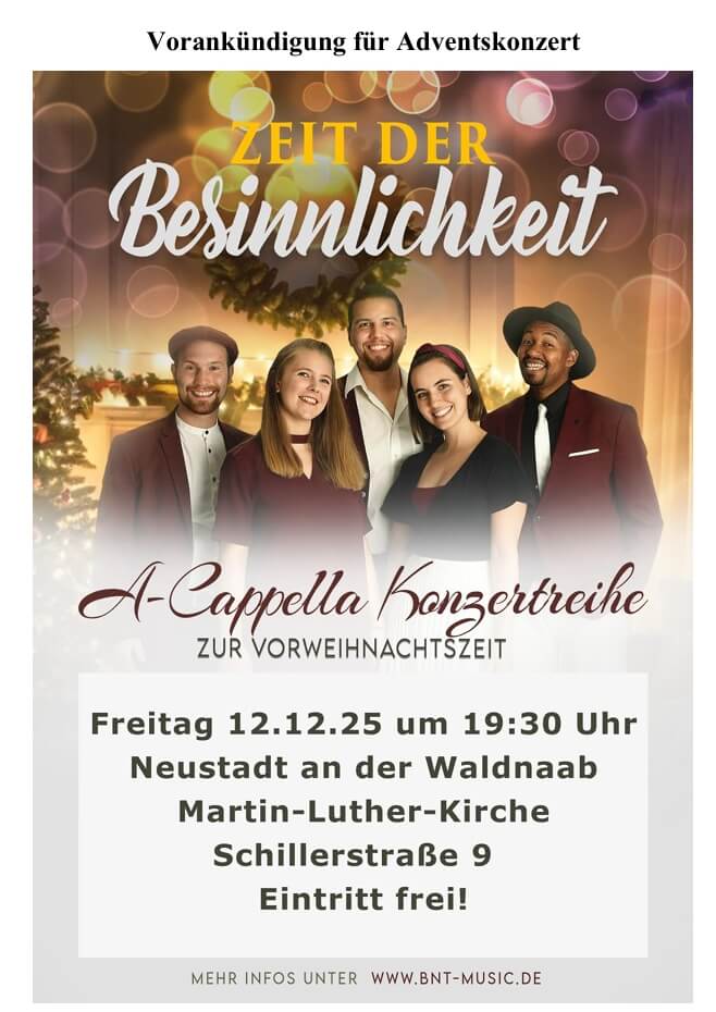 zurück zur Übersicht 12.12.2025 Adventskonzert "Zeit der Besinnlichkeit" A-Capella Konzert zur Vorweihnachtszeit mit der a capella Band B'n'T aus Regensburg.