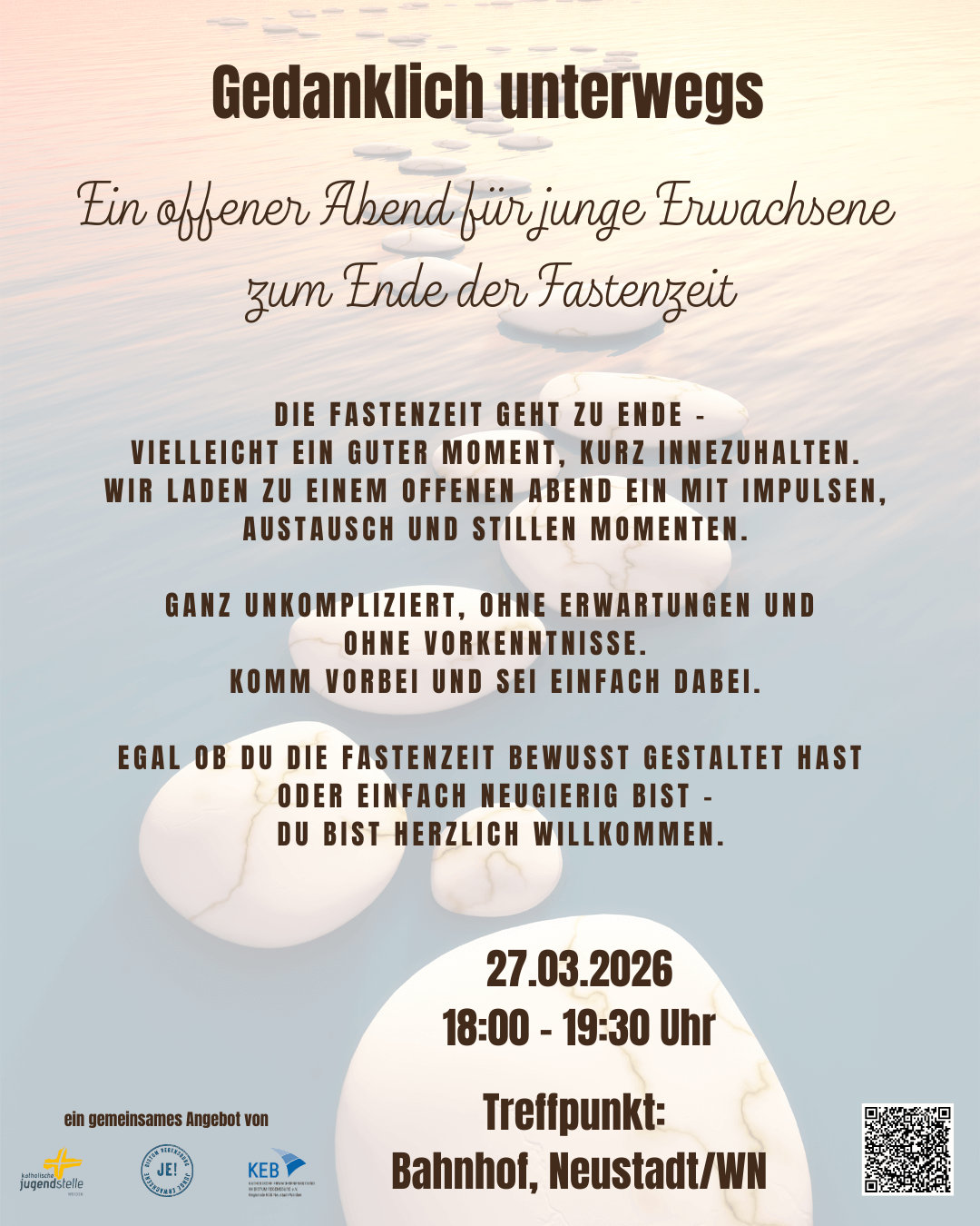 Anmeldung: bis 25.03.2026 bei der KEB Neustadt-Weiden online (https://www.keb-neustadt-weiden.de/aktuelle-veranstaltungen/6-30239-gedanklich-unterwegs-schritt-fuer-schritt-durch-die-fastenzeit/) oder telefonisch unter 0961 634964-2.
