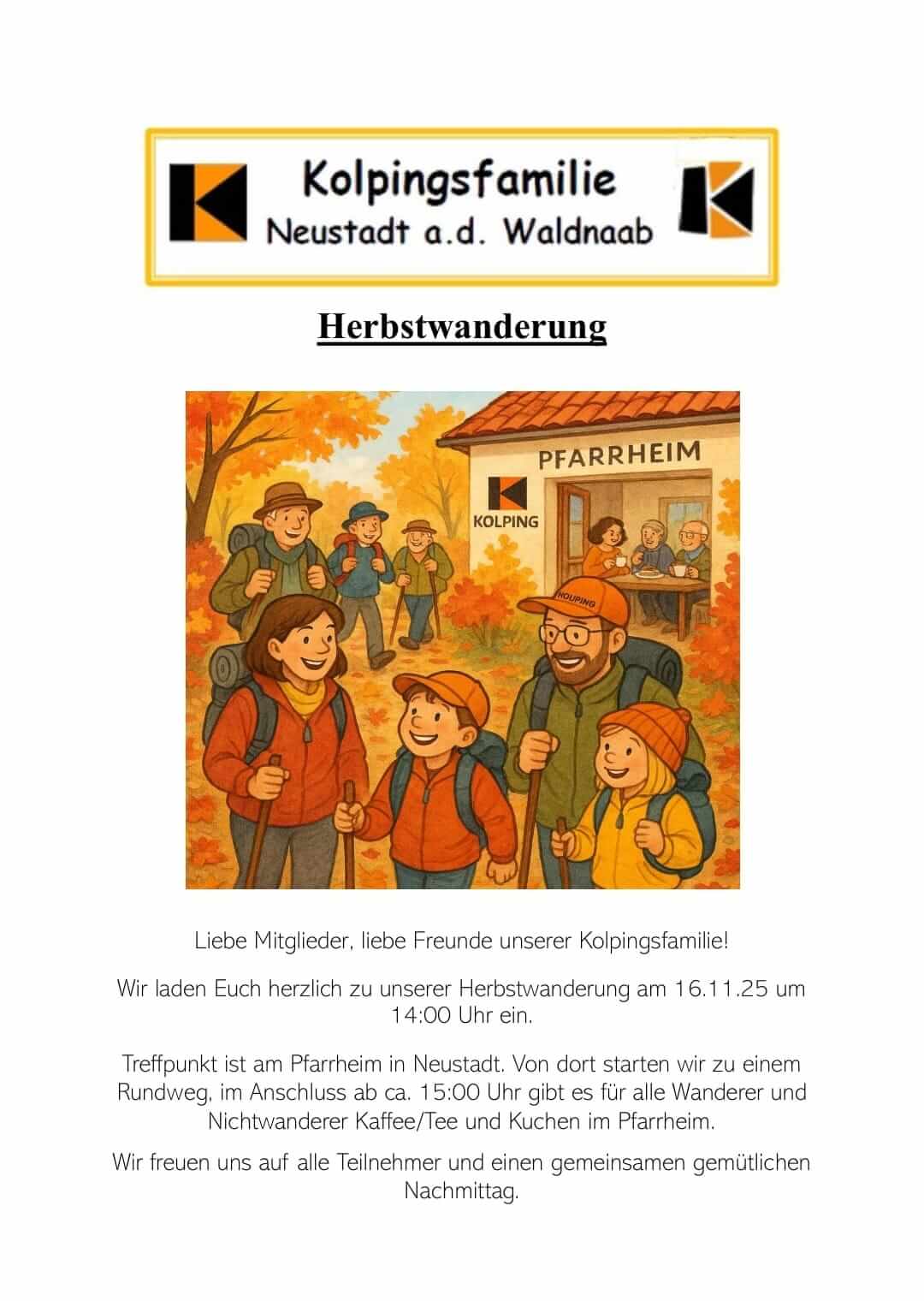 Die Kolpingsfamiile Neusadt lädt zur Herbstwadnerung mit anschließendem Kolpingkaffee am 16.11.25 ganz herzlich ein.