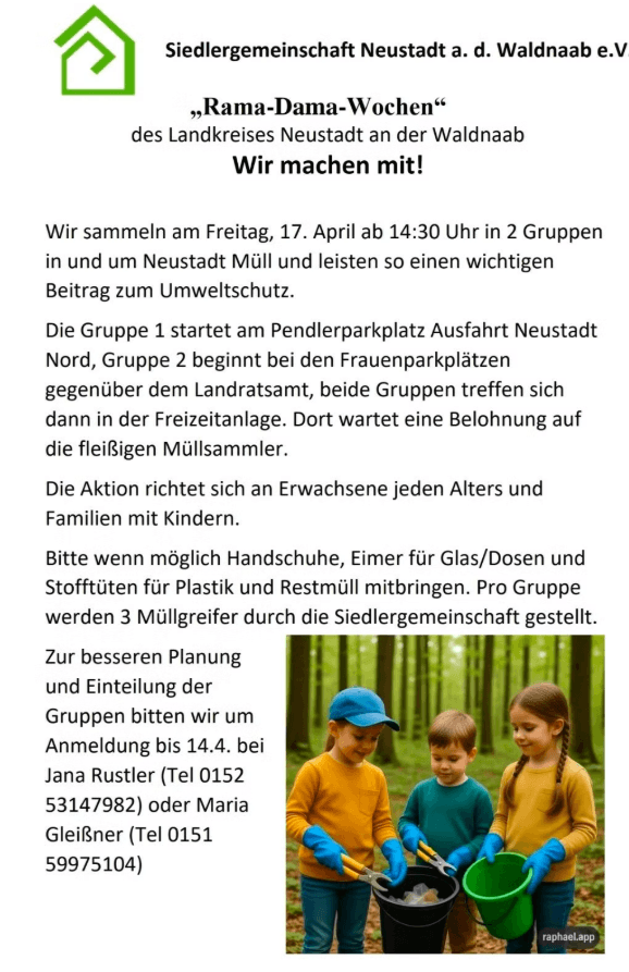 Wir sammeln am Freitag, 17. April ab 14:30 Uhr in 2 Gruppen in und um Neustadt Müll und leisten so einen wichtigen Beitrag zum Umweltschutz.