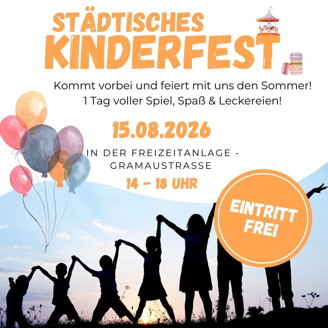 Am Samstag, den 15. August 2026, ist es wieder so weit: Das städtische Kinderfest lädt alle kleinen und großen Besucher herzlich ein!